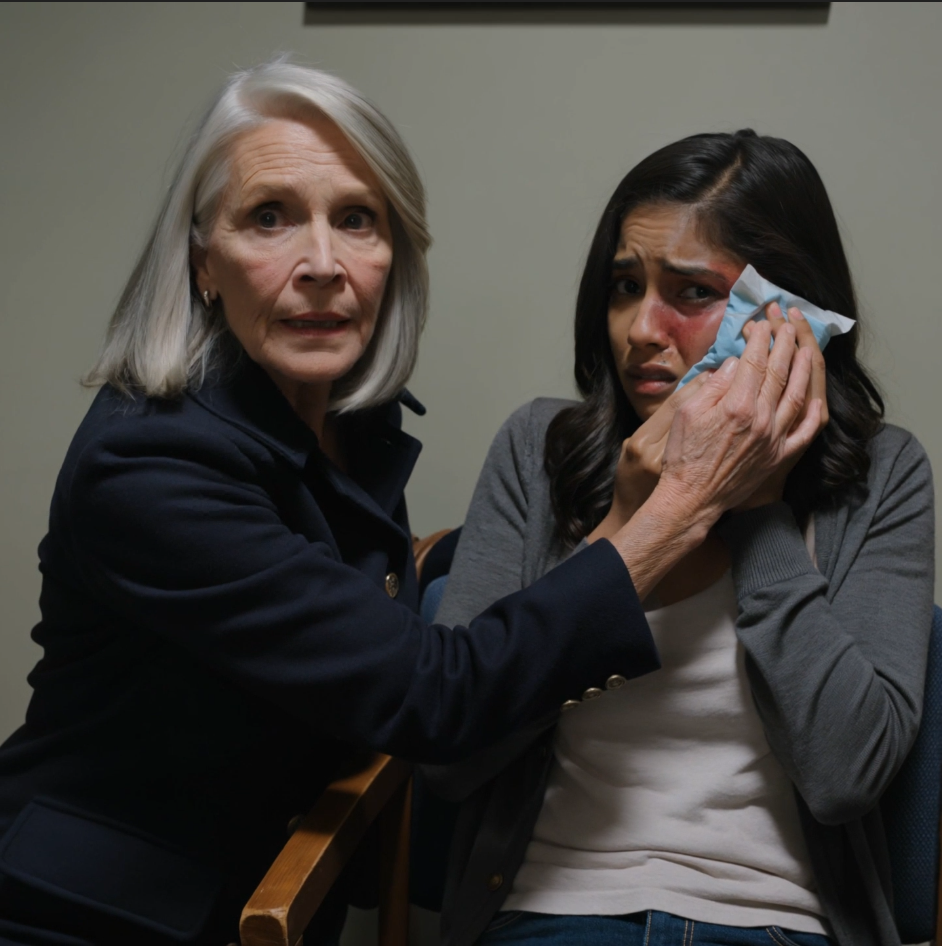 Vanessa looked up when I entered. The left side of her face had swollen badly. The bruising had deepened on the drive over, purpling at the jaw, extending toward the neck. Her left eye was nearly shut. She held a melting ice pack in both hands, the way a child holds something they’ve been told not to let go of.