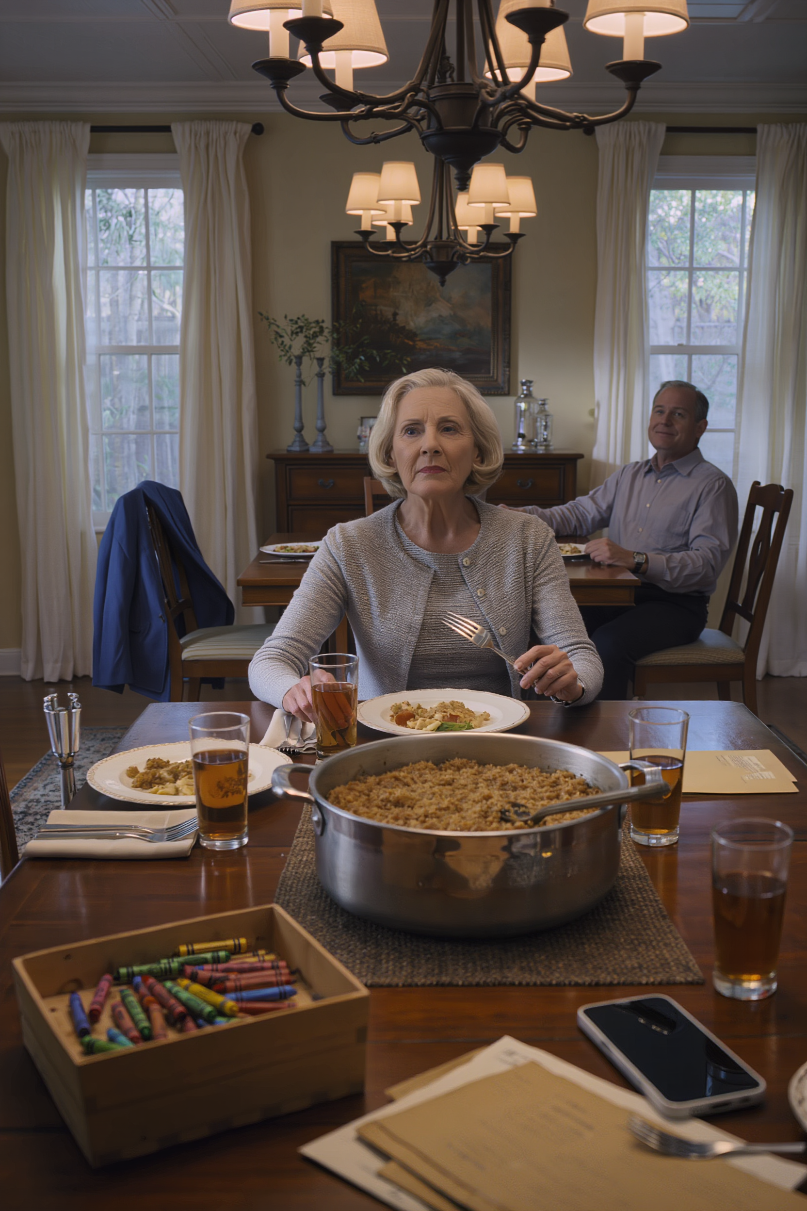 He blinked. He had expected crying. He had expected a scene. What he got was a 67-year-old woman calmly eating pot roast, and that was his first mistake.