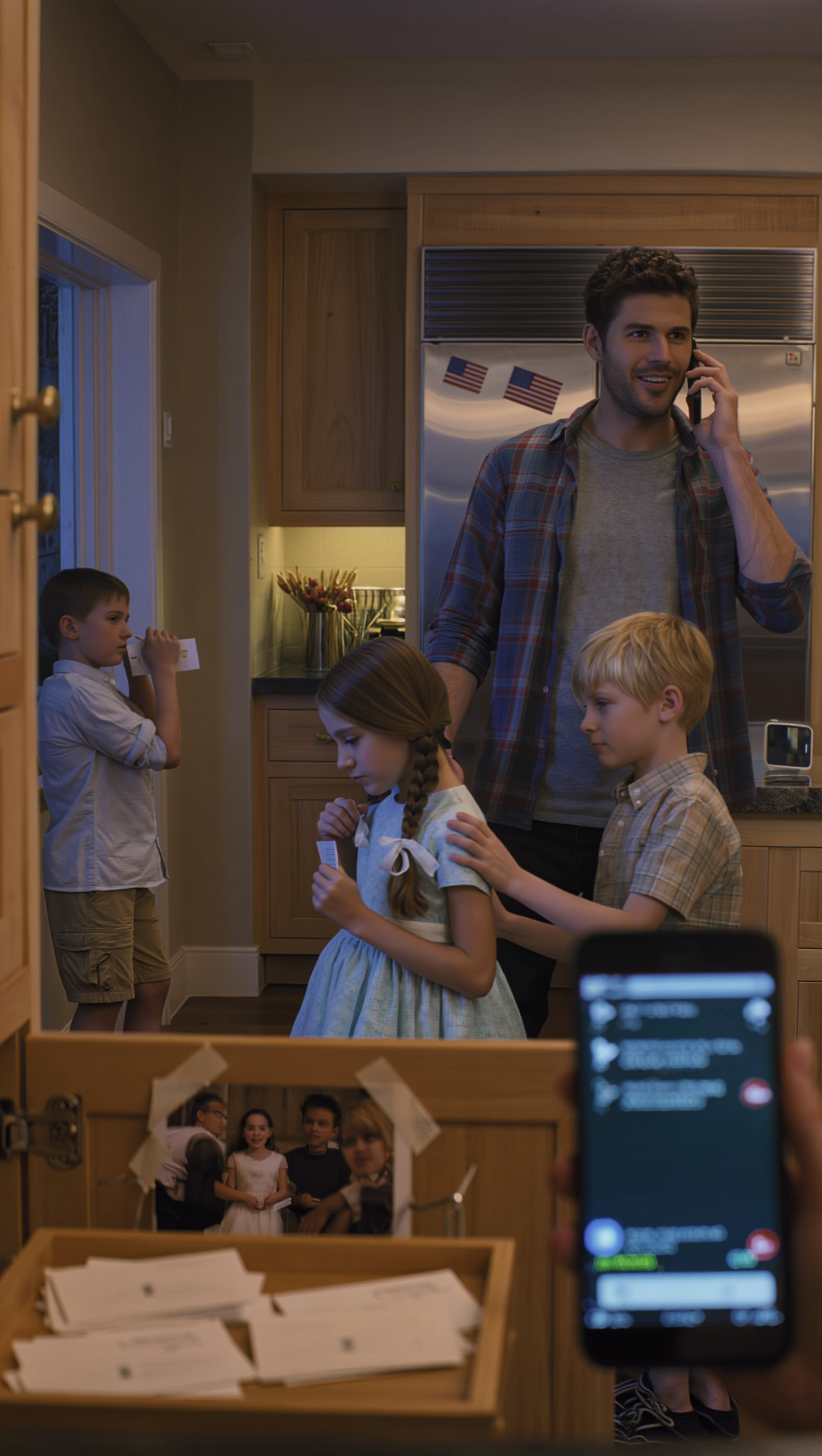 I stood there, phone pressed to my ear, staring at Ruby’s cards on the counter—her neat handwriting, her effort. And then behind me, I felt it: that shift in the air, the quiet weight of being watched.