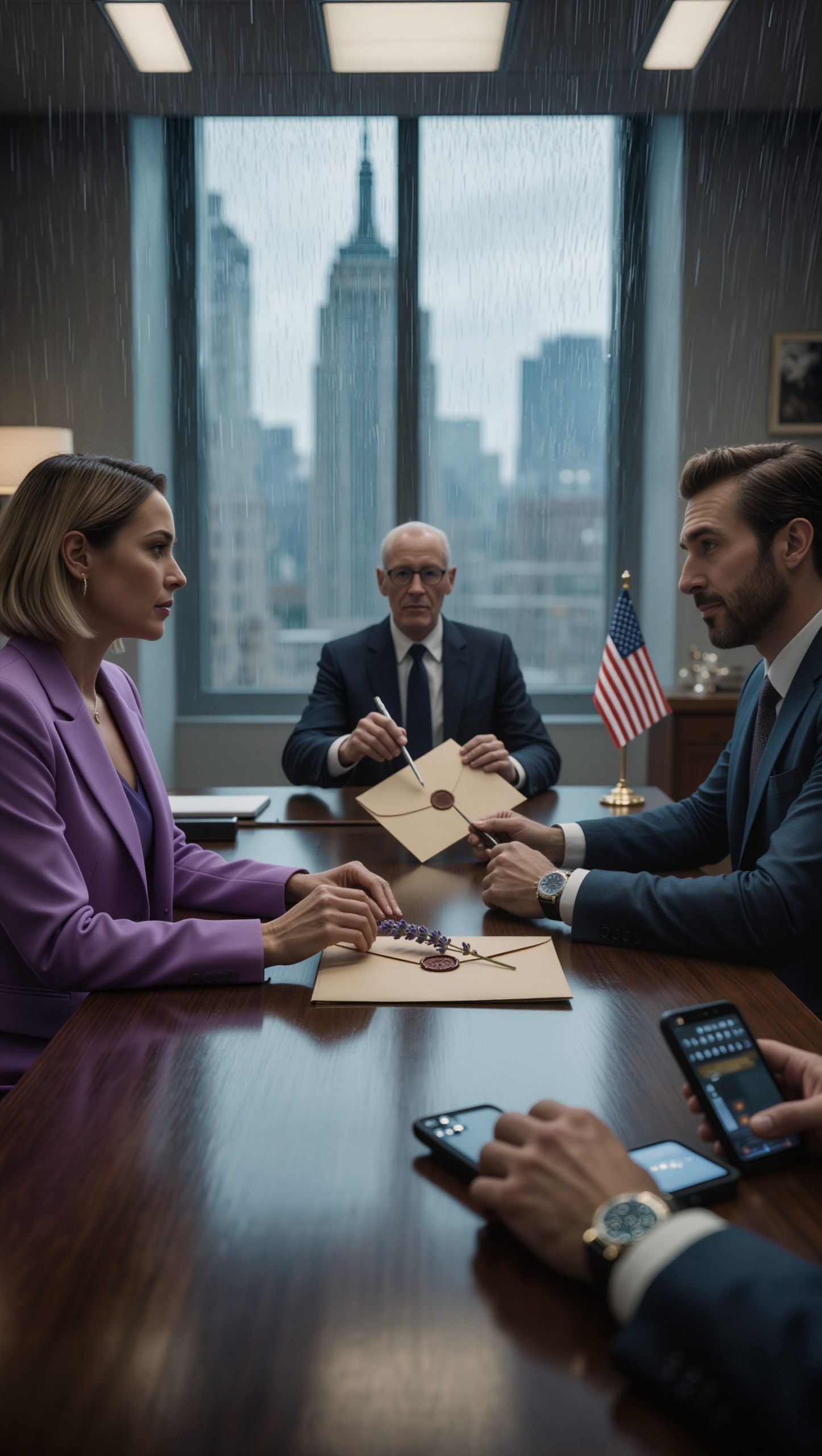 My hands rested on the table, covering the envelope. It was thick, sealed with red wax that bore a crest he would not recognize, and it still carried the faint, lingering scent of lavender and old paper.