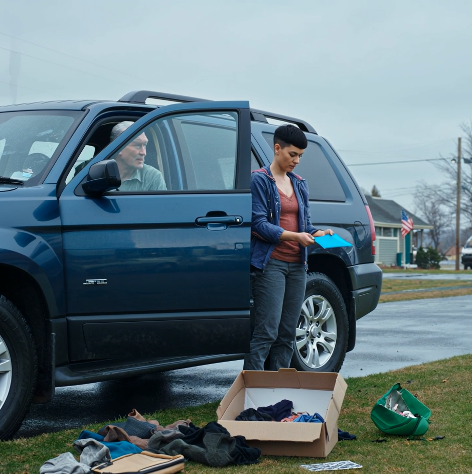 Across the street, Darla stood behind her fence. She was bundled up in a blue jacket, holding her mail like she’d forgotten what she came outside for. She didn’t wave. She didn’t call out. She just watched like she was witnessing something she wished she could pretend she hadn’t seen. Her eyes dropped to the dog tags on the ground, then lifted again. There was sympathy there, but also discomfort. People always feel awkward watching a family unravel in daylight.
