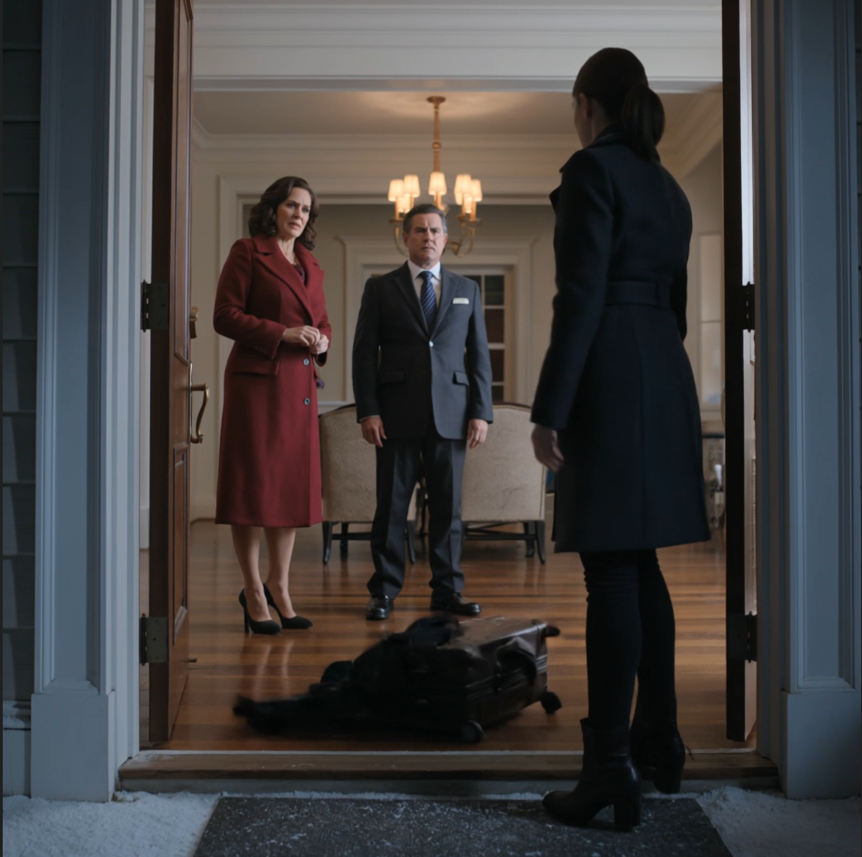 The sound of my suitcase hitting the hardwood floor cut through the room sharper than the wind outside. Not that anyone in that living room cared. The storm was loud enough to rattle the windows of the estate. Thick sheets of snow slamming against the glass like they were trying to get in. Maine hadn’t seen a storm like this in over a decade. Power lines were already going down across the county. Roads were closing. Emergency alerts had been buzzing all afternoon. And somehow the real disaster was happening inside that house. I stood there looking at the suitcase, lying on its side, one of the wheels still spinning like it hadn’t quite accepted what just happened.