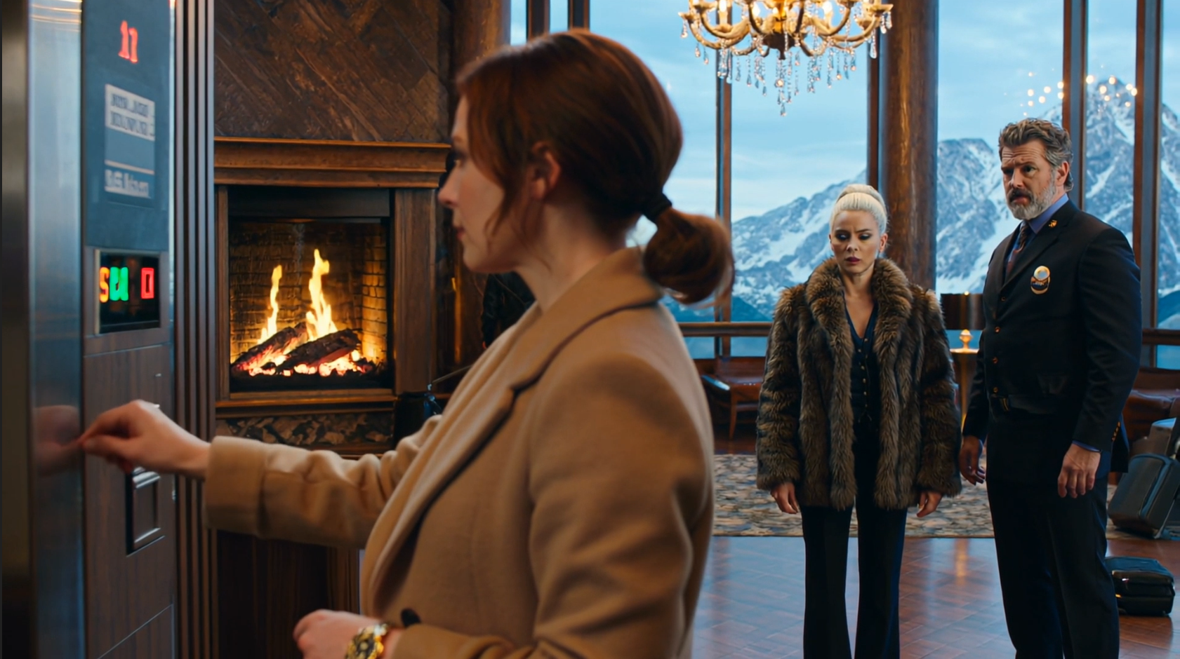 The lobby was breathtaking: soaring ceilings, a massive fireplace crackling with real wood, marble columns gleaming under crystal chandeliers.