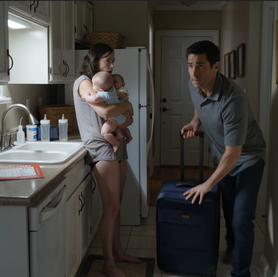 He rolled the suitcase past me, wheels rattling against the hardwood. I stood there frozen with both babies crying into my shoulders. The front door opened, closed, and that was it. Silence for half a second. Then Lily let out this piercing wail that cut right through me. Emma followed, louder.